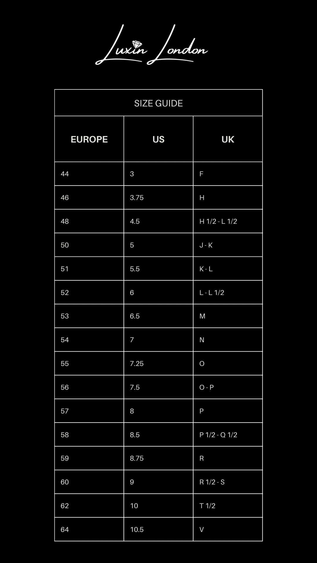 When it comes to finding the perfect fit for your ring, it's important to know your size in EUROPE, US and UK measurements. Use the chart below as a guide to determine your ring size.